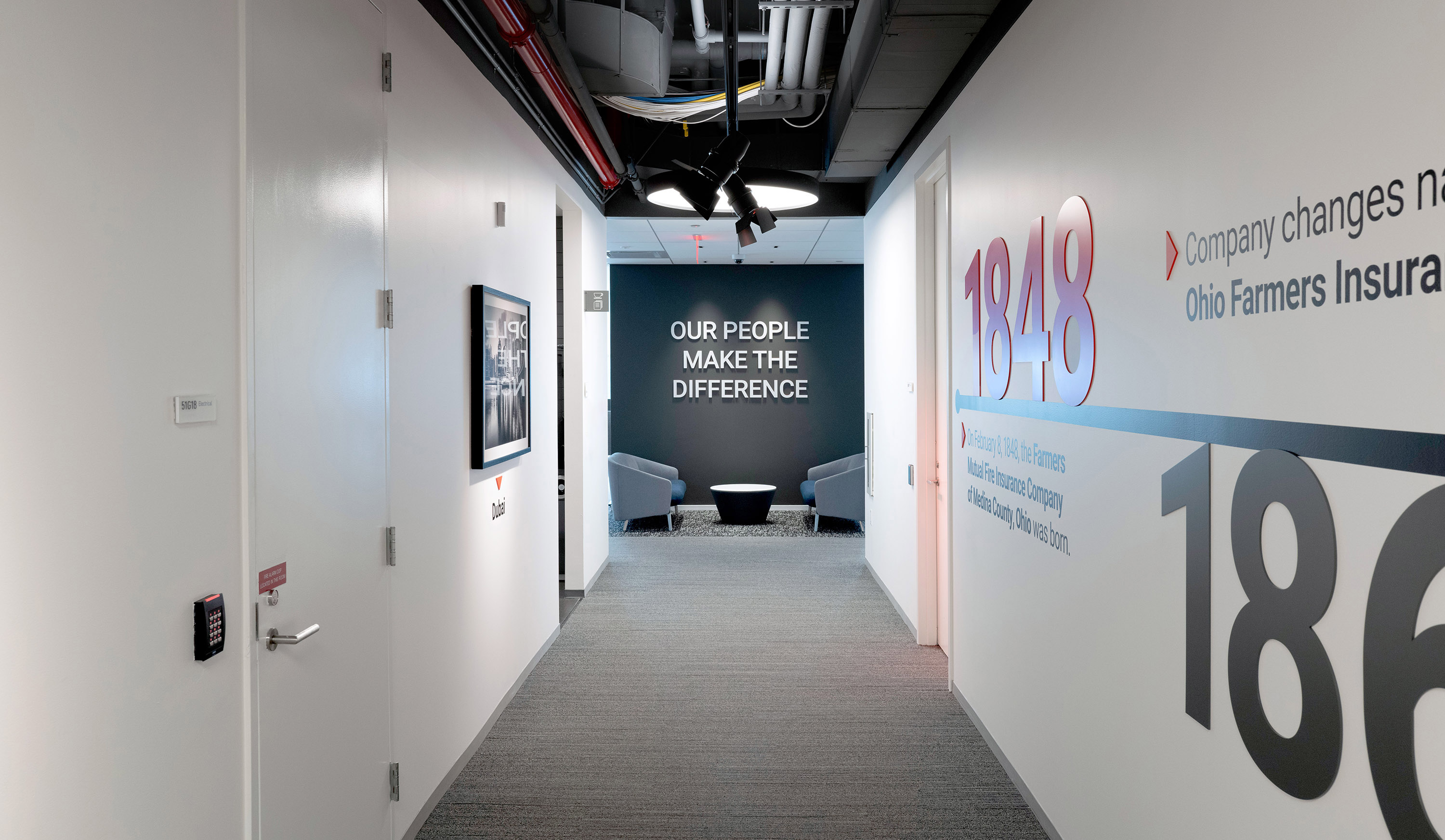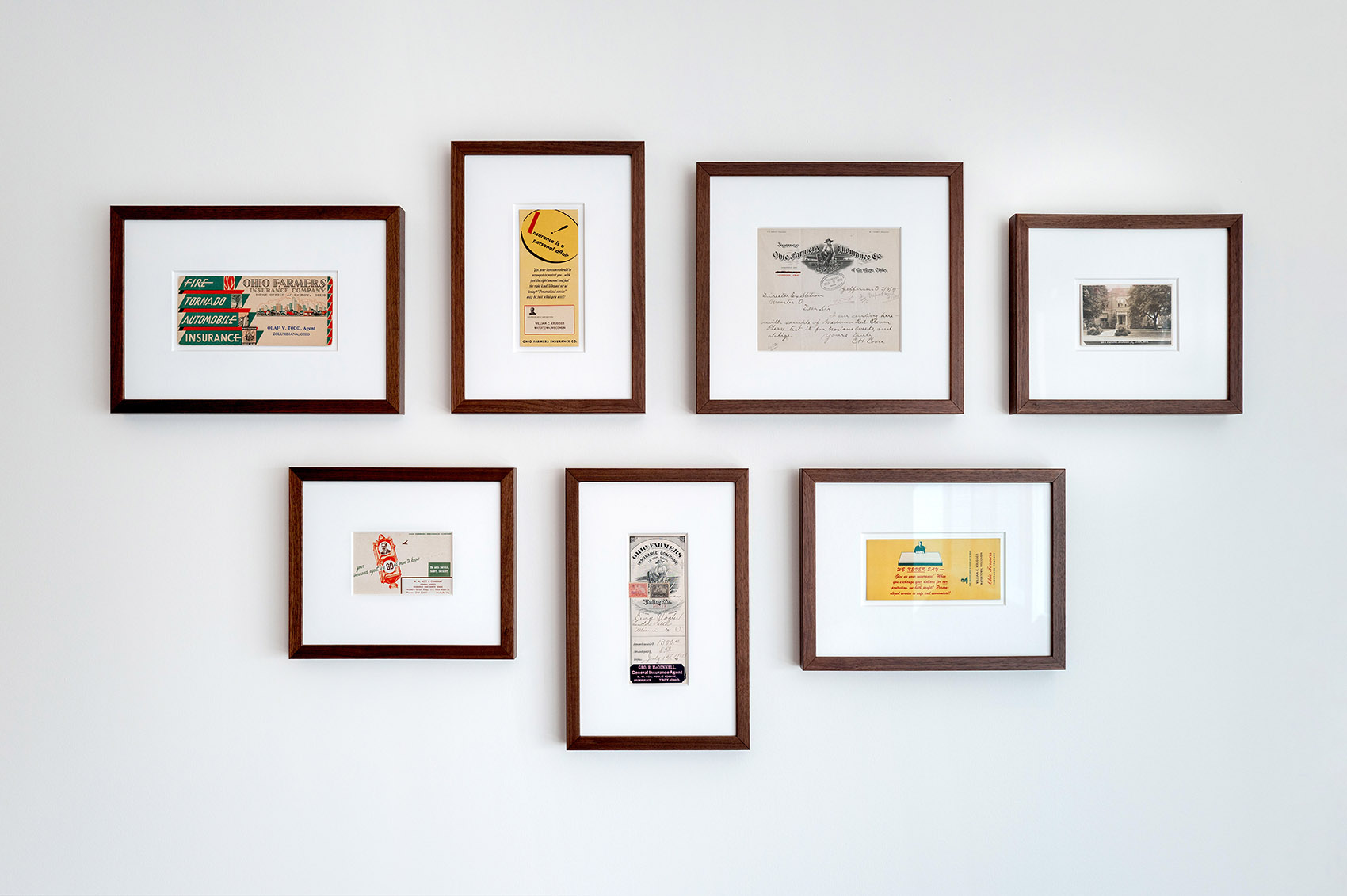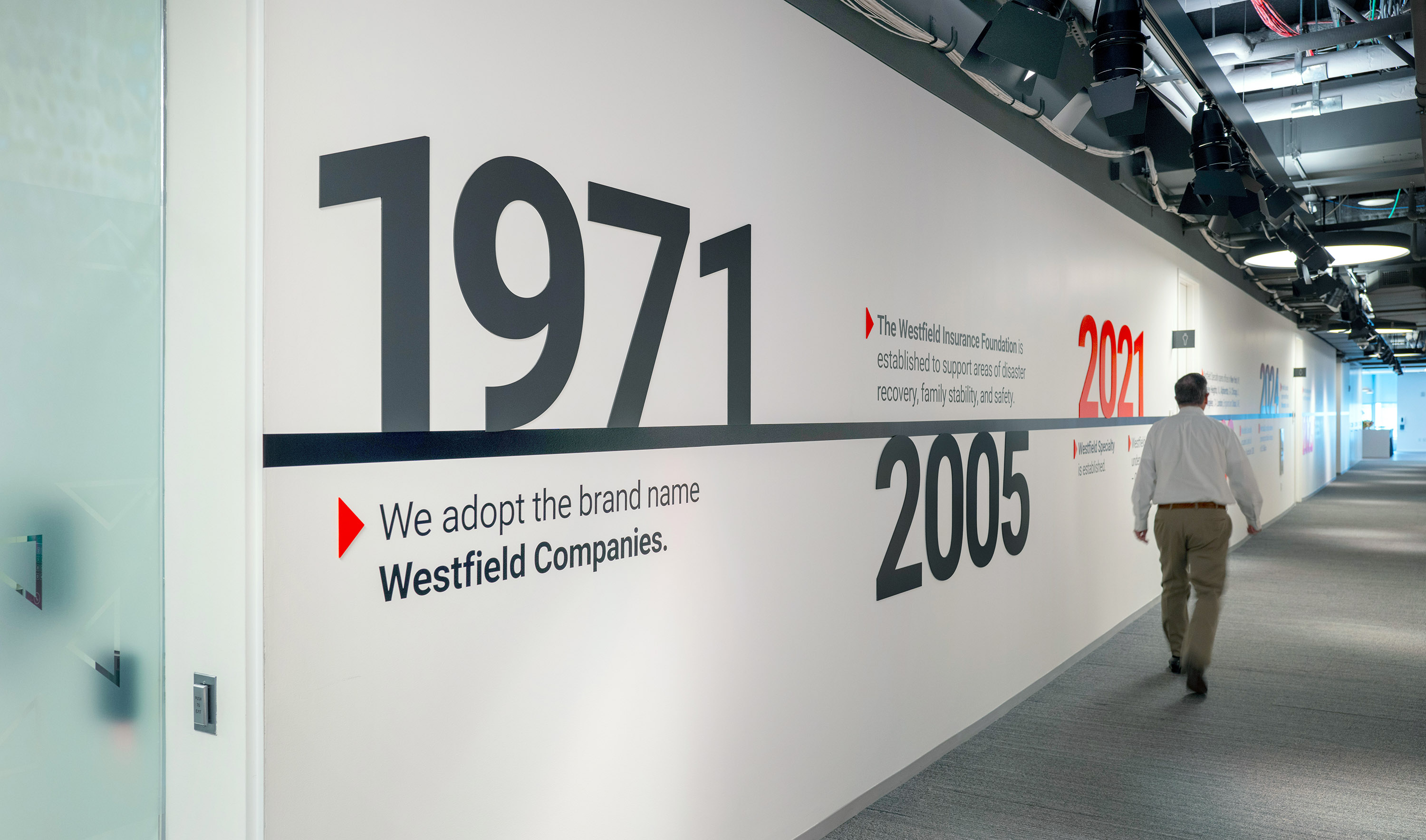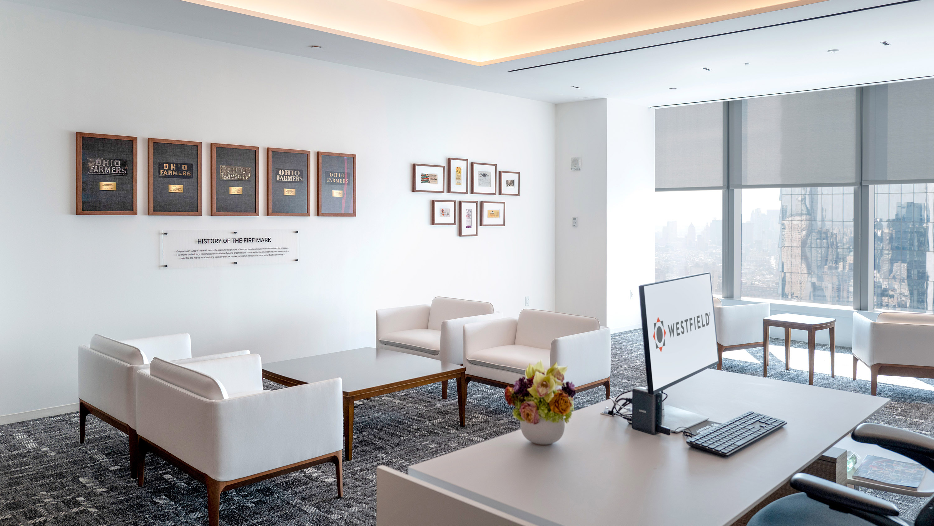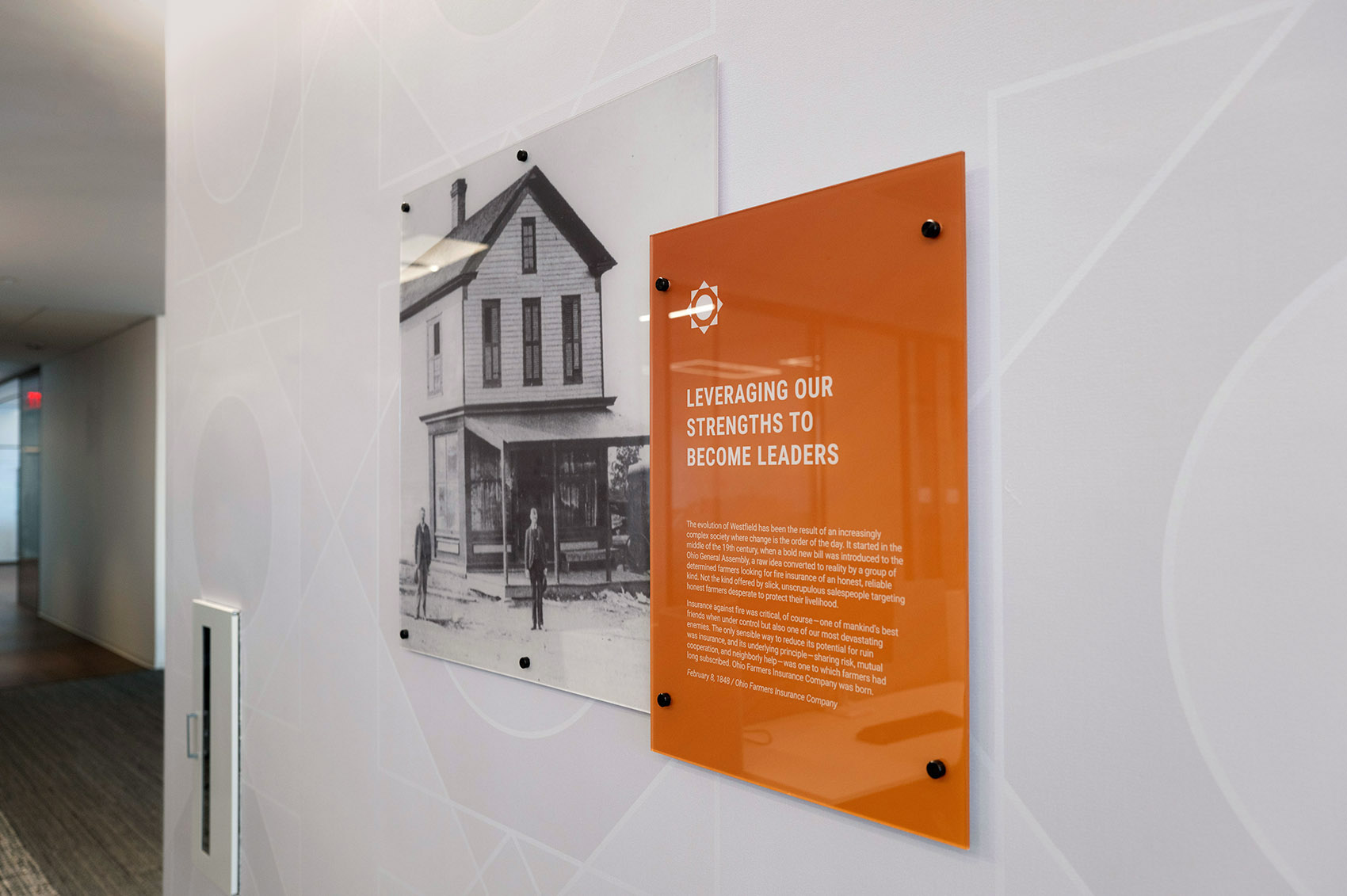 The global company known today as Westfield Specialty began as the Farmers Mutual Fire Insurance Company of Medina County, Ohio in 1848. For Westfield’s new headquarters in New York—opened 177 years later—they wanted to celebrate both their humble origins and their many transformations over the years. Visitors traversing the office are greeted by an eye-catching timeline of Westfield’s evolution and a gallery of the cities where they operate today; in the reception area, viewers can examine original artifacts from Westfield’s time as the Ohio Farmers Insurance Company.