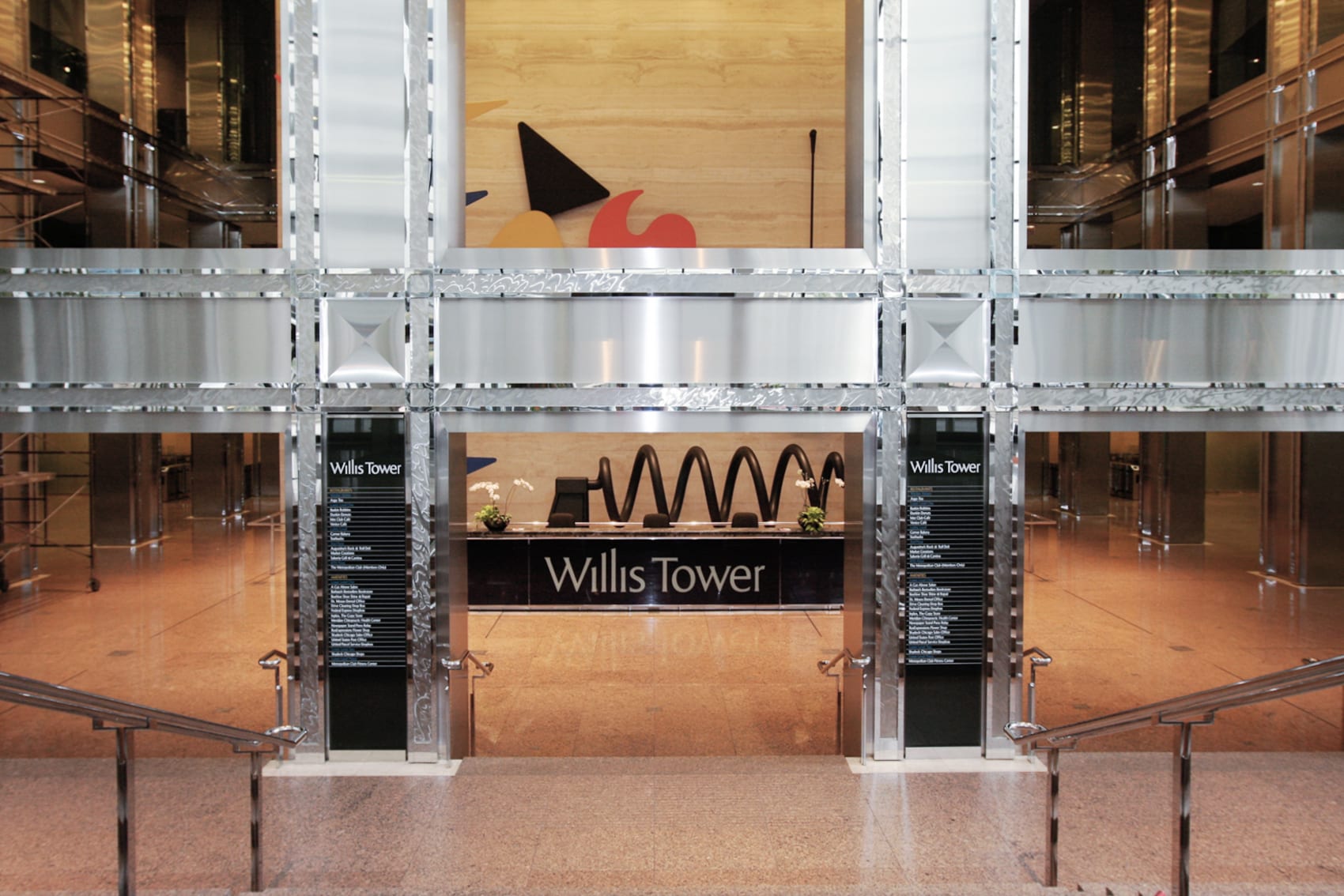 To accomplish this, Archigrafika developed, designed and delivered a distinctive visual theme and bold brand identity program for the Tower, incorporating environmental graphics, directories, concierge desks and plaza areas. Harmonious design elements, including a twenty-five-foot-diameter stainless steel globe, were used to enhance both the Willis footprint and surrounding urban landscape. As a result, the formerly austere urban plaza encircling Willis Tower has become an animated and inviting environment of form, color and movement.